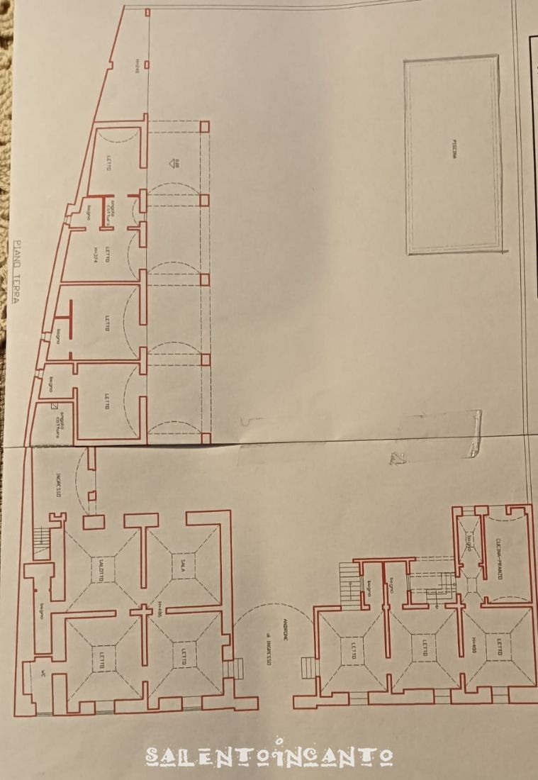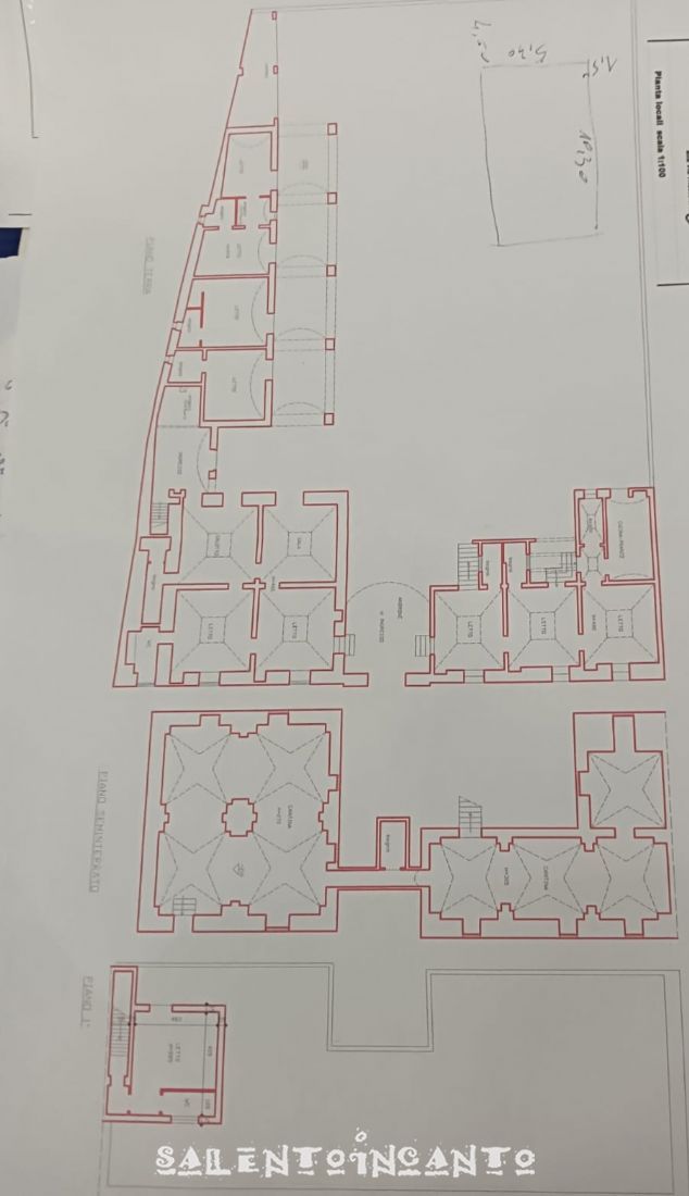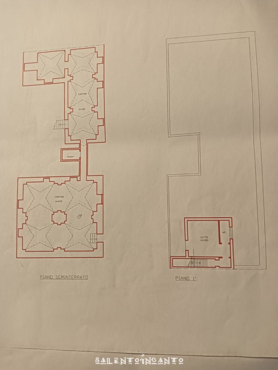 Da una parte abbiamo l'immobile principale con grande patio esterno e costituito da ingresso, cucina, ricavata in un antico e grande camino, un soggiorno, un salone con camino in pietra, due camere da letto e due bagni. Dal soggiorno, tramite una tipica scala in pietra leccese, si raggiunge la terza camera da letto con bagno e tutta l'area solare della proprietà da cui è possibile godere della vista sull'intero giardino e su tutto il centro storico. L'immobile è reso unico dalla presenza delle volte a botte con pietra a vista e dalle volte a padiglione decorate con affreschi.